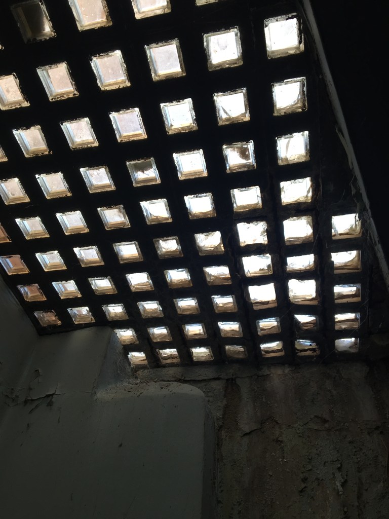 This is a glass tiled ceiling and patrons walk on stepping off the sidewalk.